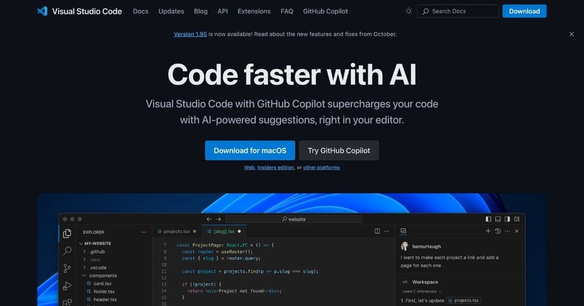 - Code with GitHub Copilot: VisualStudioCode comes equipped with GitHub Copilot, an AI-powered pair programmer that offers smart suggestions to help you write code faster and more efficiently. By leveraging Copilot’s completions and inline chat features, you can enhance your coding experience and boost productivity.